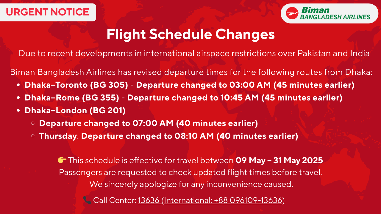 বিমান বাংলাদেশ এয়ারলাইন্সের ফ্লাইট সংক্রান্ত জরুরী ঘোষণা